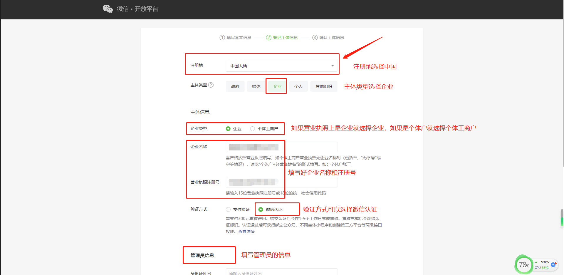 第三步:填写好注册地、主体类型、主体信息和管理员的信息。